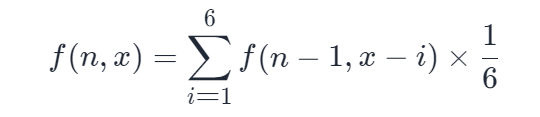 动态规划。假设已知 n - 1 个骰子的所有解 f(n - 1),此时添加一个骰子,求第 n 个骰子时,和为 x 的概率 f(n, x):