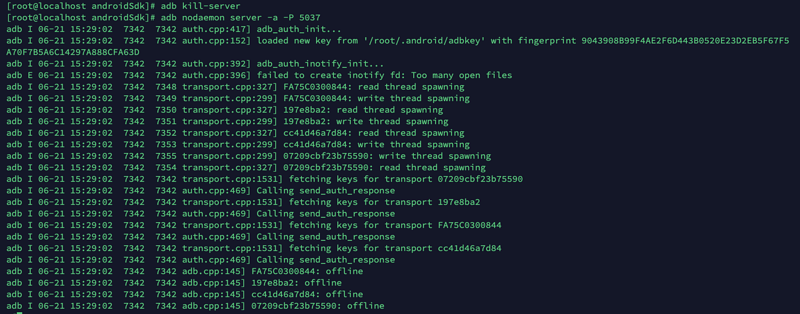 docker 里面需要挂载 Linux 宿主机的 usb 设备到 adb 容器里面