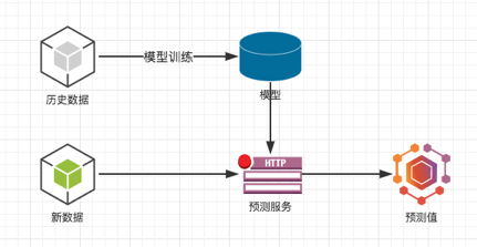 这个图就是一个人工智能服务的略缩图。 在历史数据上训练出模型,并发布一个预测服务,这个预测服务可能就是一个 http 的接口。 然后新的数据过来以后,根据模型算出一个预测值。经过刚才的说明,我们看到数据是人工智能的根本。拥有的数据越多,越丰富,越真实,那么训练出的模型效果越好。