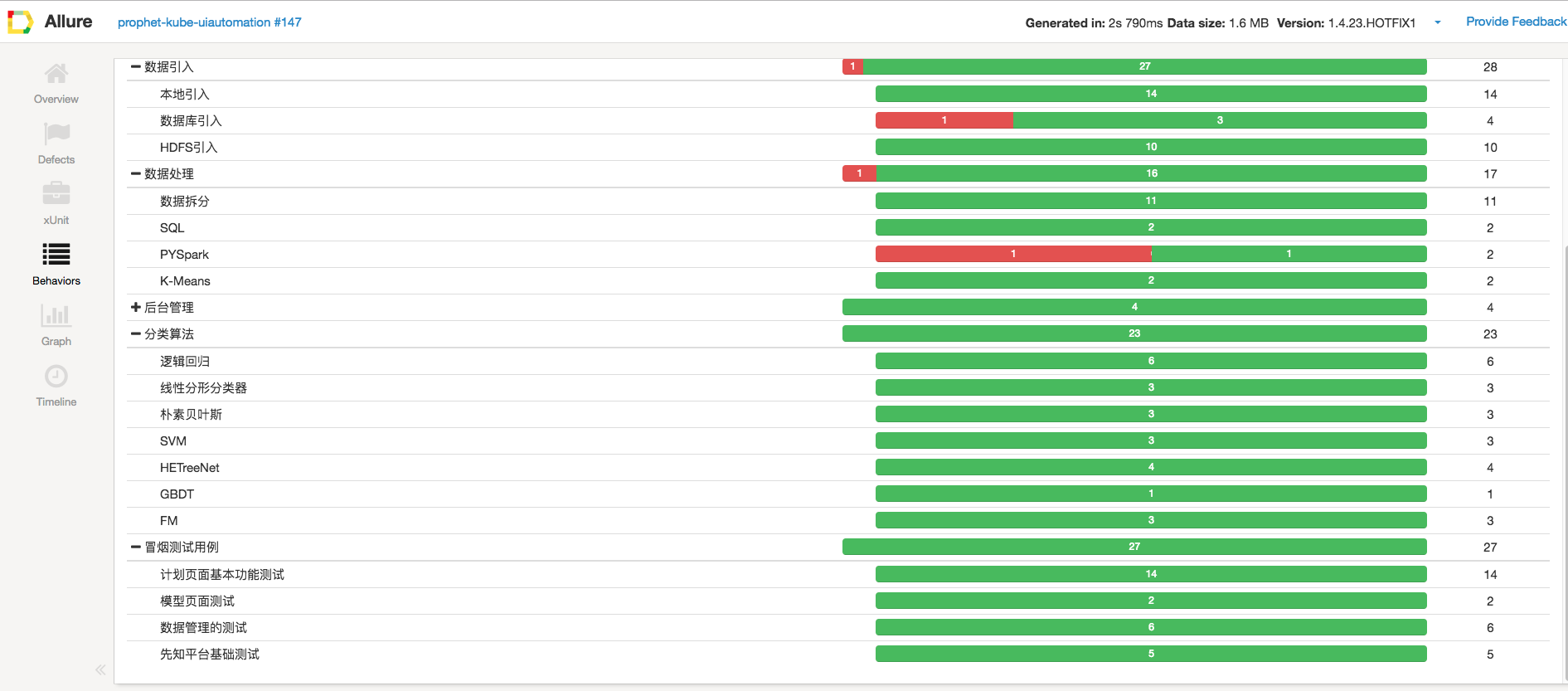 集群中所有的镜像都过公司内部搭建的镜像仓库进行共享, 我们在集群之上安装了各种服务来满足测试环境的需要。 例如使用 NFS 做数据持久化, Heapster+Grafana+InfluxDB 做性能监控,kube-DNS 做服务发现,dashboard 提供 web 管理界面,weave 做集群网络,ingress 做服务的转发。 并且我们在这个整体上针对 k8s 的 APIserver 做了一层 cli 的封装。 我们尝试过脚本管理, web 服务管理,但是发现大家对这些方式的接受度都不高。 我们面对的大多数都是一帮做梦都在写代码的人,所以我们换做提供一个 cli 的方式可以让使用者更灵活来定制自己需要的服务。 通过这种形式,我们在公司内部搭建了一个可以提供测试资源的私有云,配合 jenkins 我们可以很方便的一键部署我们需要的环境并执行 UT,接口,UI 自动化测试等等,并提供一个详细的测试报告。下面是我们的部署一个环境后所提供的测试报告