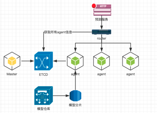 下面一个场景是预测服务的。预测服务的架构一般都满复杂的,为了实现高可用,负载均衡等目的,所以一般都是标准的服务发现架构。以 etcd 这种分布式存储机制为载体。 所有的预测服务分别以自注册的方式来提供服务。