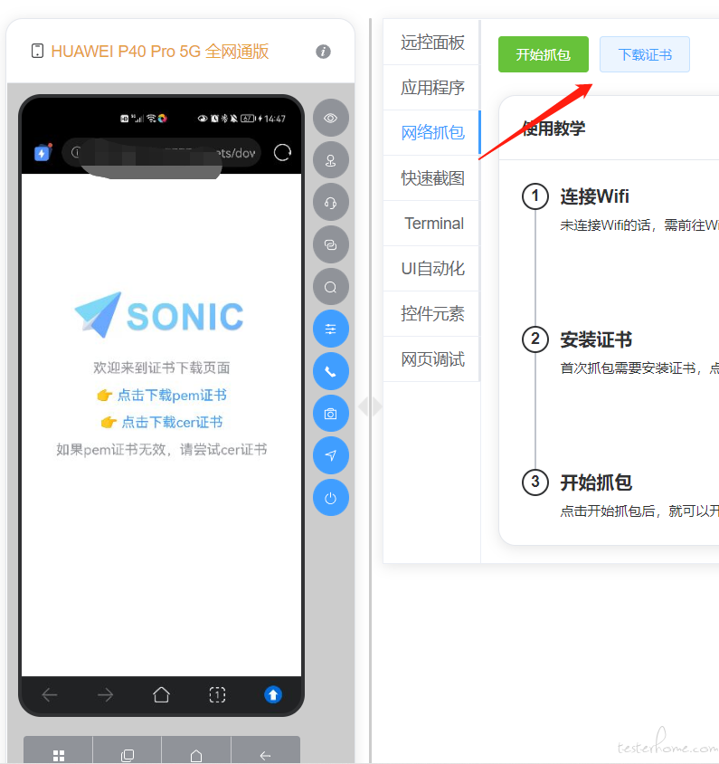 - go-mitmproxy 默认证书生成在用户根目录.mitmproxy 文件夹下面,这个有一个不够好的地方是用户需要先找到证书才能 push 给手机安装,那么 sonic 作为平台化的东西,这个肯定是不够友好的。于是微调了代码,给原项目加上了自定义证书生成目录,这样的话 sonic 的 Agent 端也可以直接做一层文件转发。手机只需要去到 Agent 下载页即可下载。
