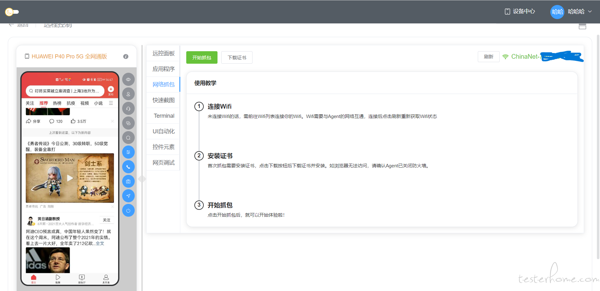 这样,就可以完成开启 go-mitmproxy、利用 Agent 做证书下载服务、连接代理、开启 Web 页面一系列操作了。而用户只需要简单操作,就能体验到完整的功能。