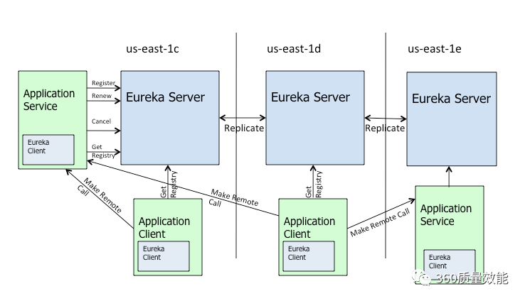 Eureka Client向Eureka Serve注册,并将自己的一些客户端信息发送Eureka Serve。然后,Eureka Client通过向Eureka Serve发送心跳(每30秒)来续约服务的。如果客户端持续不能续约,那么,它将在大约90秒内从服务器注册表中删除。注册信息和续订被复制到集群中的Eureka Serve所有节点。来自任何区域的Eureka Client都可以查找注册表信息(每30秒发生一次)。根据这些注册表信息,Application Client可以远程调用Applicaton Service来消费服务。