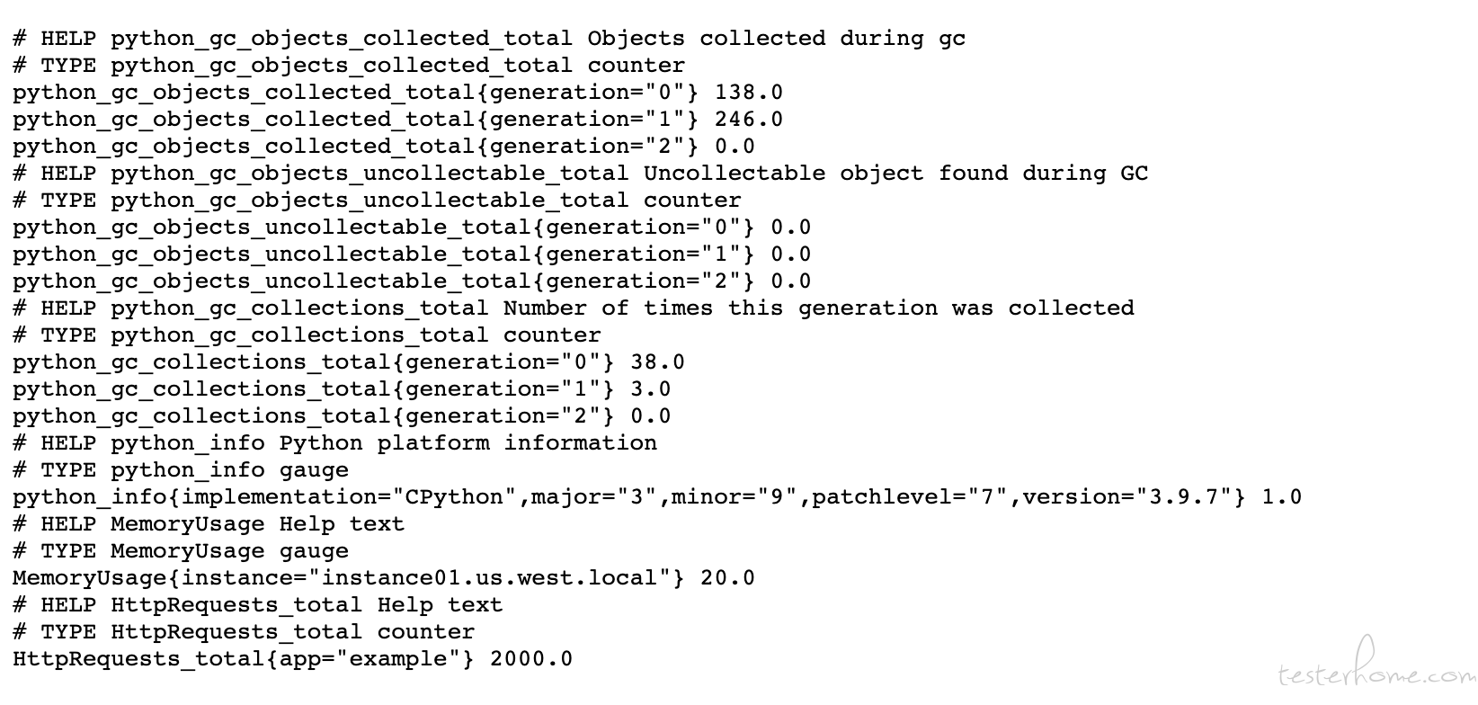 其中 # 开头的是某个或者某些指标的帮助文档, 而非 # 开头的每一行表示当前 Exporter 采集到的一个监控样本。由于我是使用普罗米修斯的 python client 编写的 exporter, 所以它自带了 python 的多个监控指标。 而下面的MemoryUsage 和HttpRequests 就是我自己定义的监控指标了。 这其中MemoryUsage 和HttpRequests 是指标名称, 花括号内的是这个指标的 label, label 是个非常重要的机制, 它把相同的监控指标按自定义的 label 类型进行分类,比如这个监控数据是哪个机器的, 哪个机房的等等。 是编写 exporter 的人定义上去的, 目的是在后续使用 PromQL 的时候用户可以用 label 把监控数据进行分类查询 。 比如用户想要抓取每台机器上的 CPU Load 数据,分别显示出来 。 那它就要在查询 cpu_load15 的时候用 label 进行分组了。 最后面的浮点数值就是监控数据的值了。