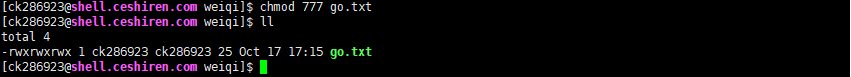 修改新文件权限为可读、可写、可执行。 chmod 777 go.txt