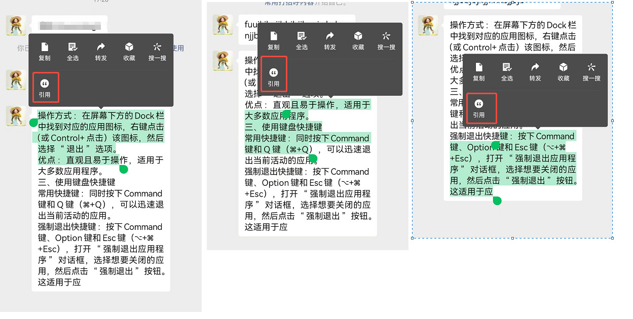 2、点击引用,输入框下方的引用内容,点击后可以打开全屏查看文字页面,选中内容高光显示3s。点击【定位到聊天位置】,回到聊天编辑位置。