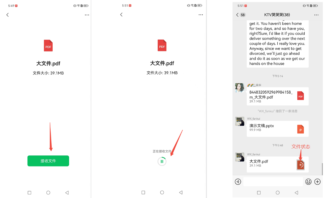 ④点击文件气泡,点击右上角-保存,保存成功⑤ios、PC端、企业微信端发送的文件,Android接收正常