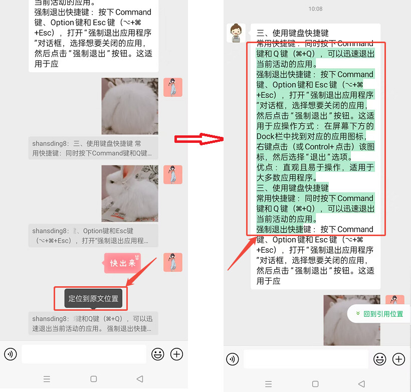3、发送成功后,长按引用内容,点击【定位到原文位置】,选中内容高光显示3s。