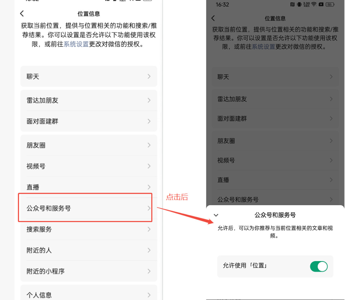 1、"我-设置-个人信息与权限-权限管理-位置信息-公众号和服务号"选项文案显示正常,如下图