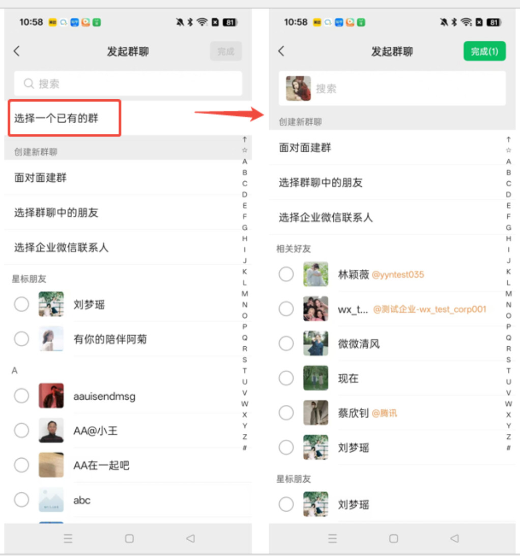 1.2. 只要选中一个或1个以上朋友,就将「选择一个已有的群」栏隐藏,取消所有选择,则自动恢复显示。