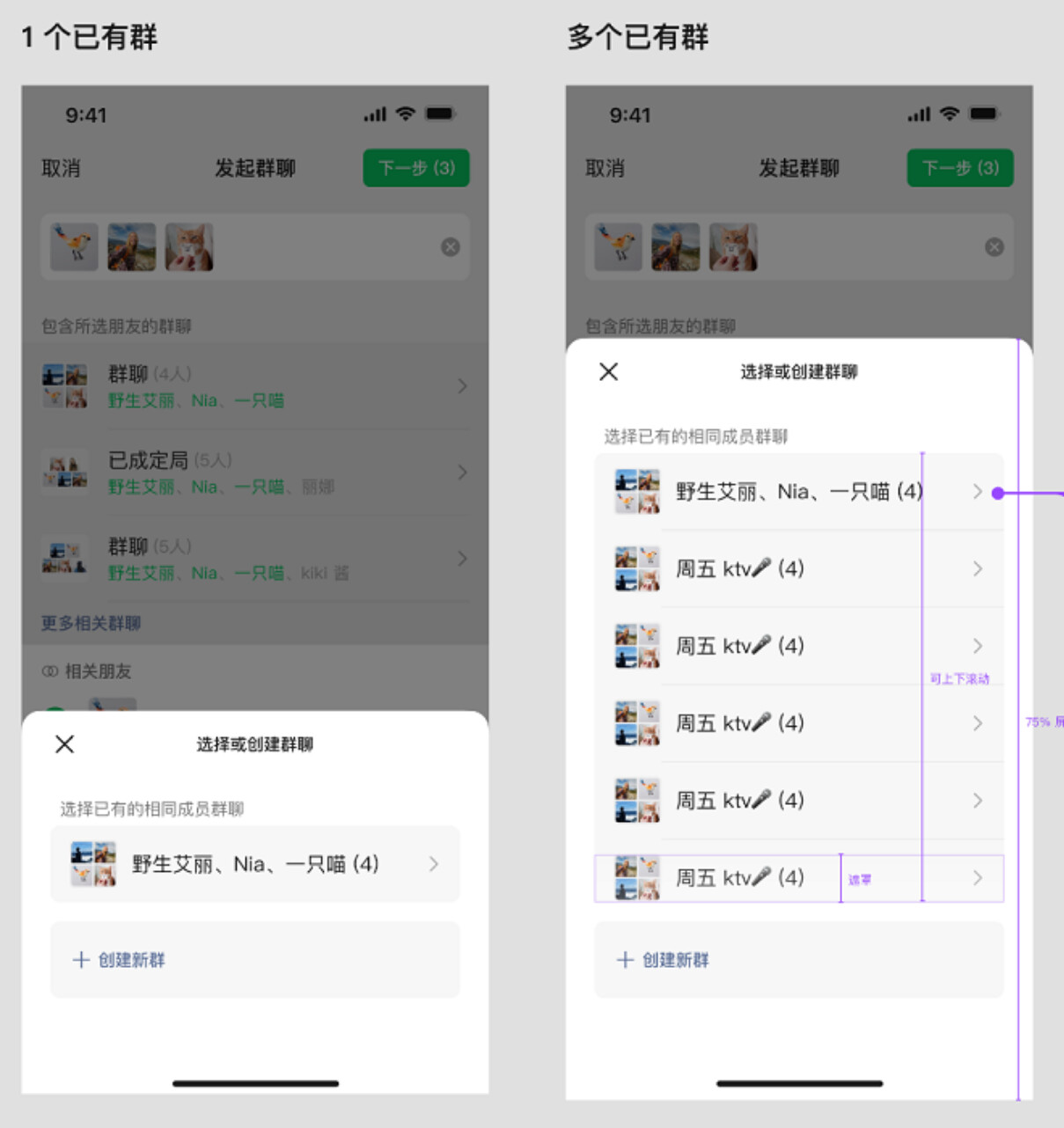 1.4.2. 选中2个及以上的朋友,若有 100% 匹配群成员则弹窗提示。弹窗中显示「包含想通成员的已有群」列表+【+创建新群】按钮。