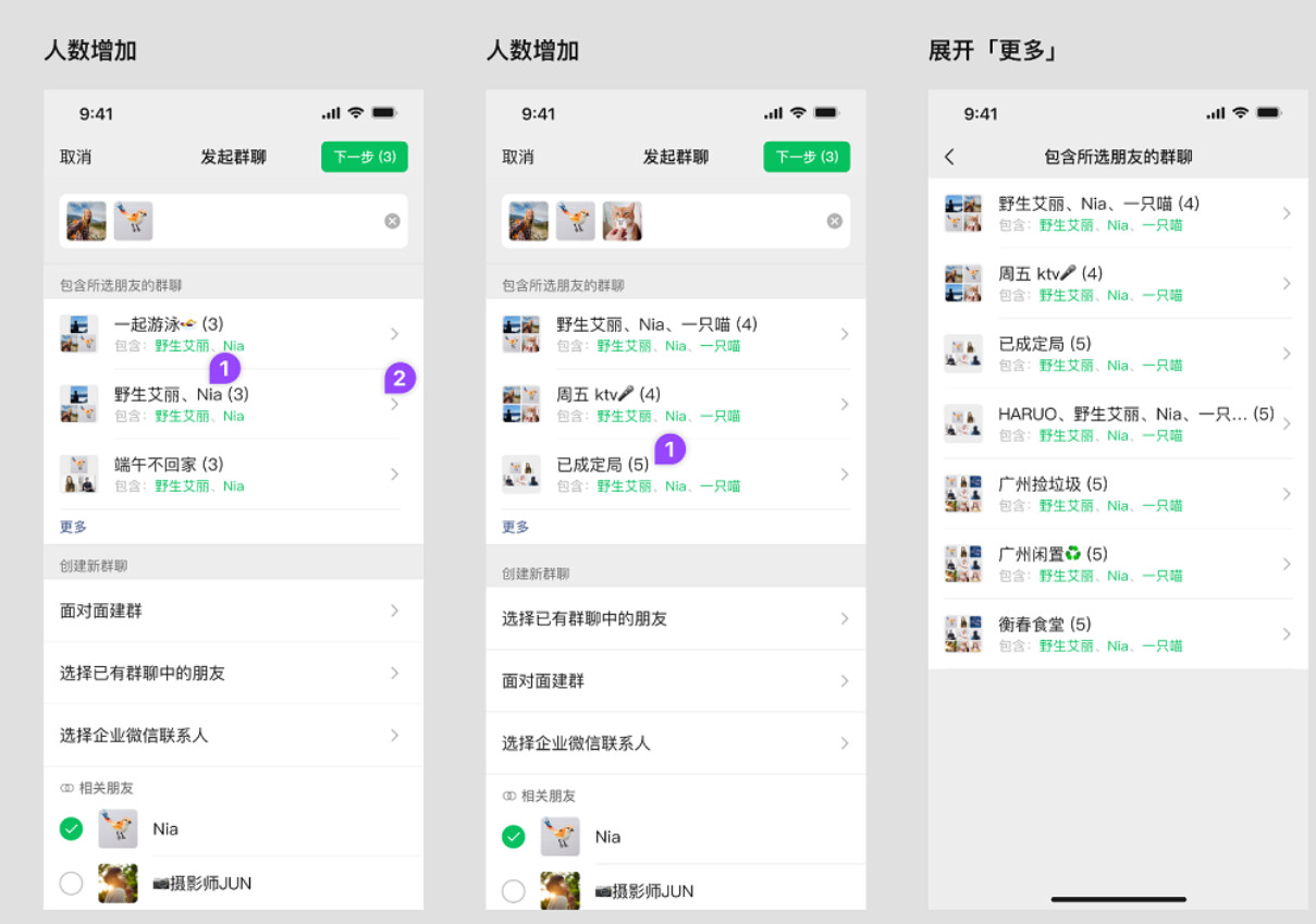 1.3. 选择用户后若符合推荐规则,则显示「包含所选朋友的群聊」推荐列表,