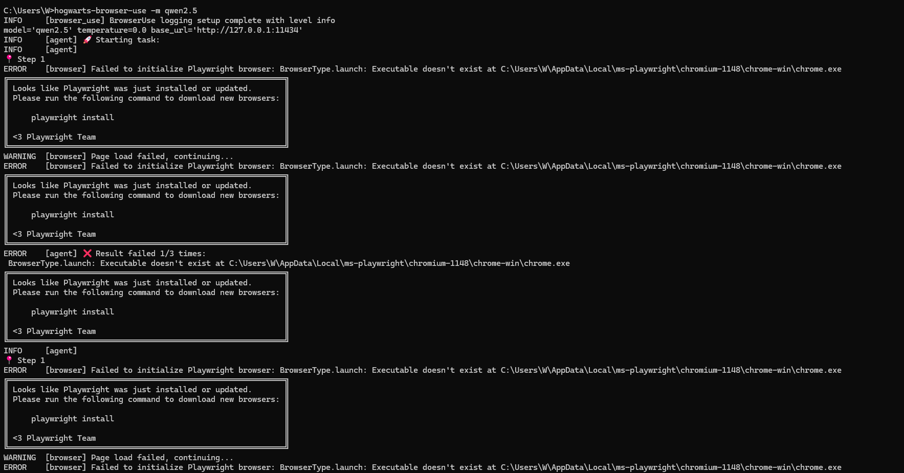 在使用pip安装好相关依赖后,执行 文档中【Client Challenge hogwarts-browser-use 命令时(谷歌浏览器已全部关闭),提示报错,执行 hogwarts-browser-use -m qwen2.5 命令时也同样报错。执行 hogwarts-browser-debug 命令可已正常打开浏览器。