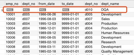 现在departments表中有一个新建的部门DQA,部门编号为d010,此部门暂时还未招聘员工,要将此部门信息也展示出来就要使用right join