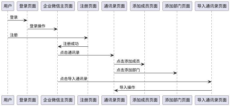 注册页面、 登录页面、 企业微信主页面、 通讯录页面 、添加成员页面 、添加部门页面、导入通讯录页面 时序图